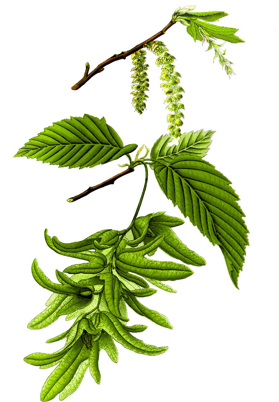 Foglie alterne distiche, oblungo-ovate con margine doppiamente seghettato a base tronca o cordata lunghe, con apice acuto e inizialmente pubescenti lungo le nervature secondarie che sono in numero 10-15, ben evidenti con aspetto bolloso, il picciolo è lungo 1cm.