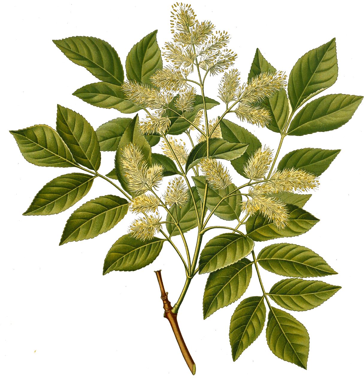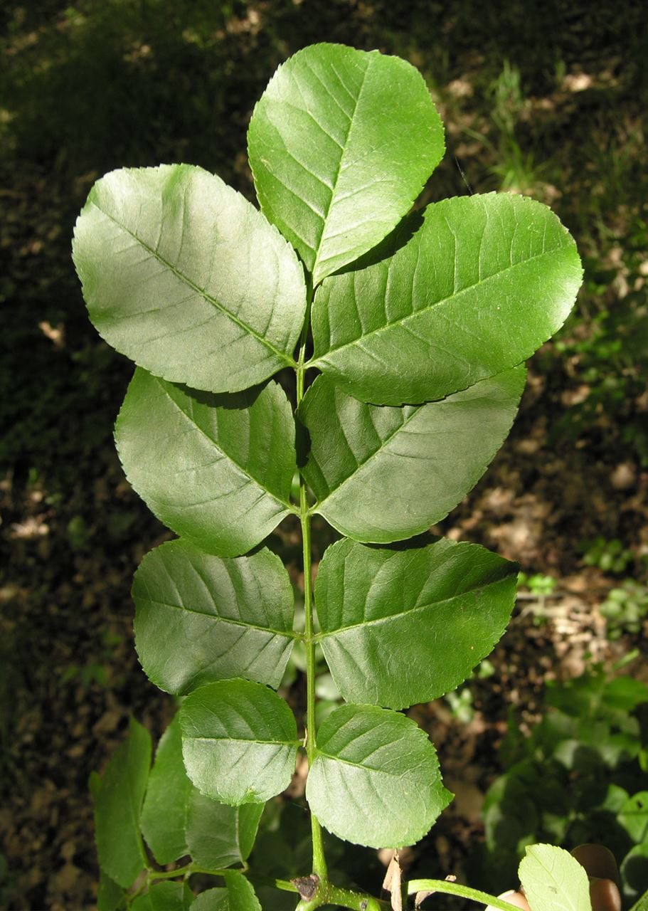 Foglie opposte, imparipennate, caduche, formate da 5-9 (per lo più 7) foglioline ellittico-lanceolate, rotondate o cuneate alla base, cuspidate e brevemente ma chiaramente picciolate; lamina fogliare verde opaca, più chiara inferiormente, a margine dentellato-seghettato.
