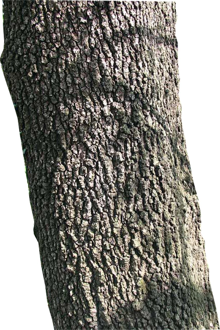 Corteccia grigio scura rotta in tante piccole squame irregolari.