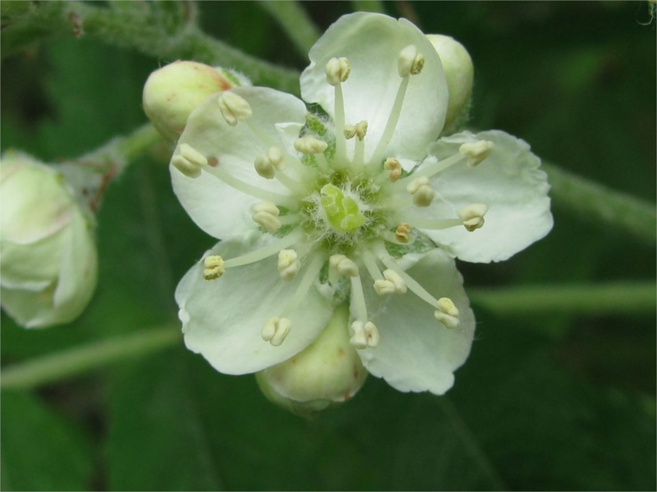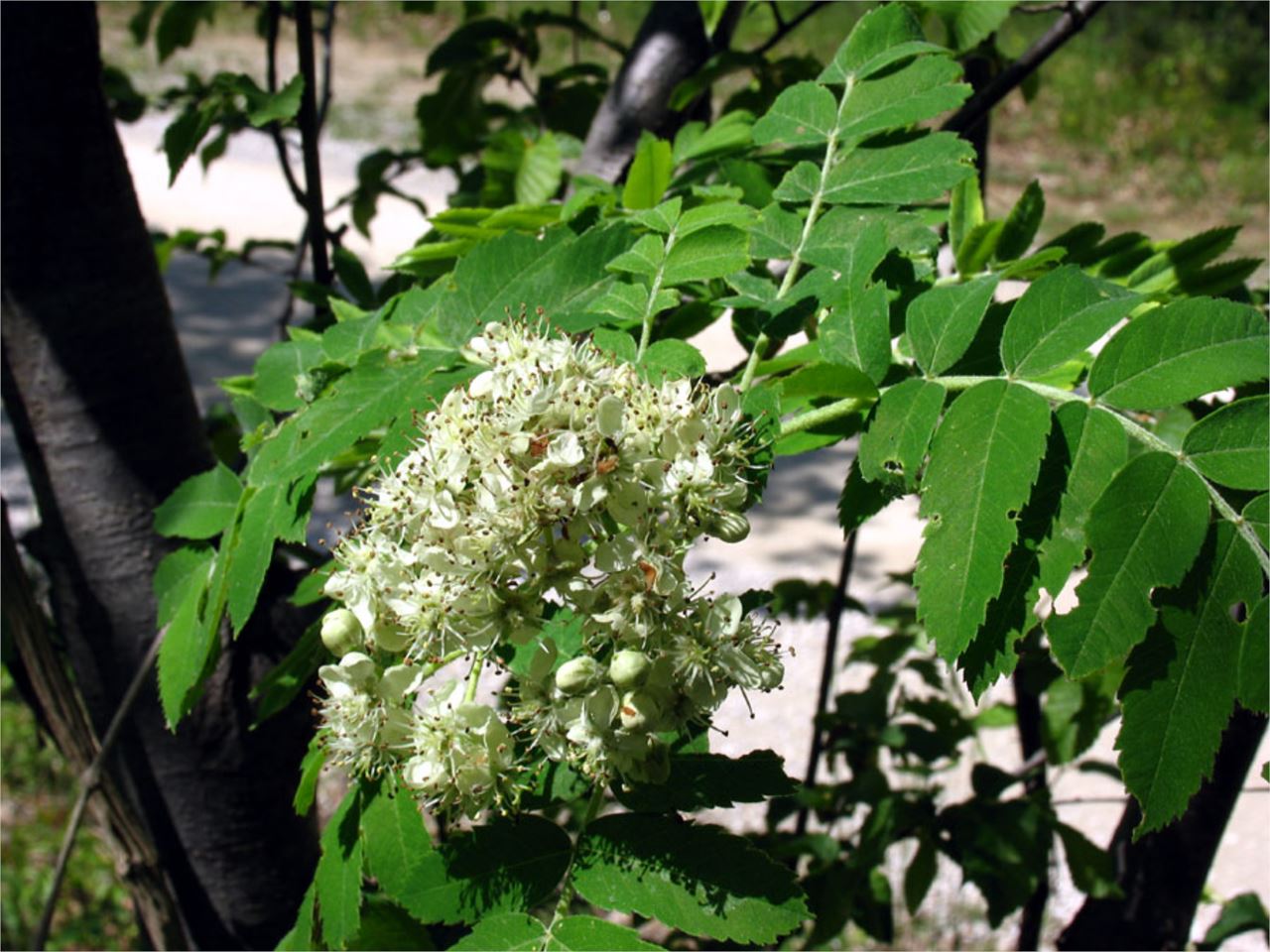 I fiori ermafroditi e numerosi, sono riuniti in corimbi ramosi e tomentosi, sono portati da peduncoli prima tomentosi, poi glabrescenti.