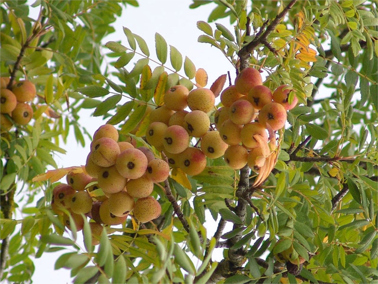Le foglie sono alterne, composte, imparipennate, lunghe sino a 20 centimetri, formate da 6÷10 paia di foglioline ovate o lanceolate, sessili, arrotondate alla base, intere nel terzo inferiore, poi con margine acutamente dentato ad apice acuto, lunghe sino a 6 centimetri e fogliolina terminale più piccola; la pagina superiore glaucescente, quella inferiore pubescente.