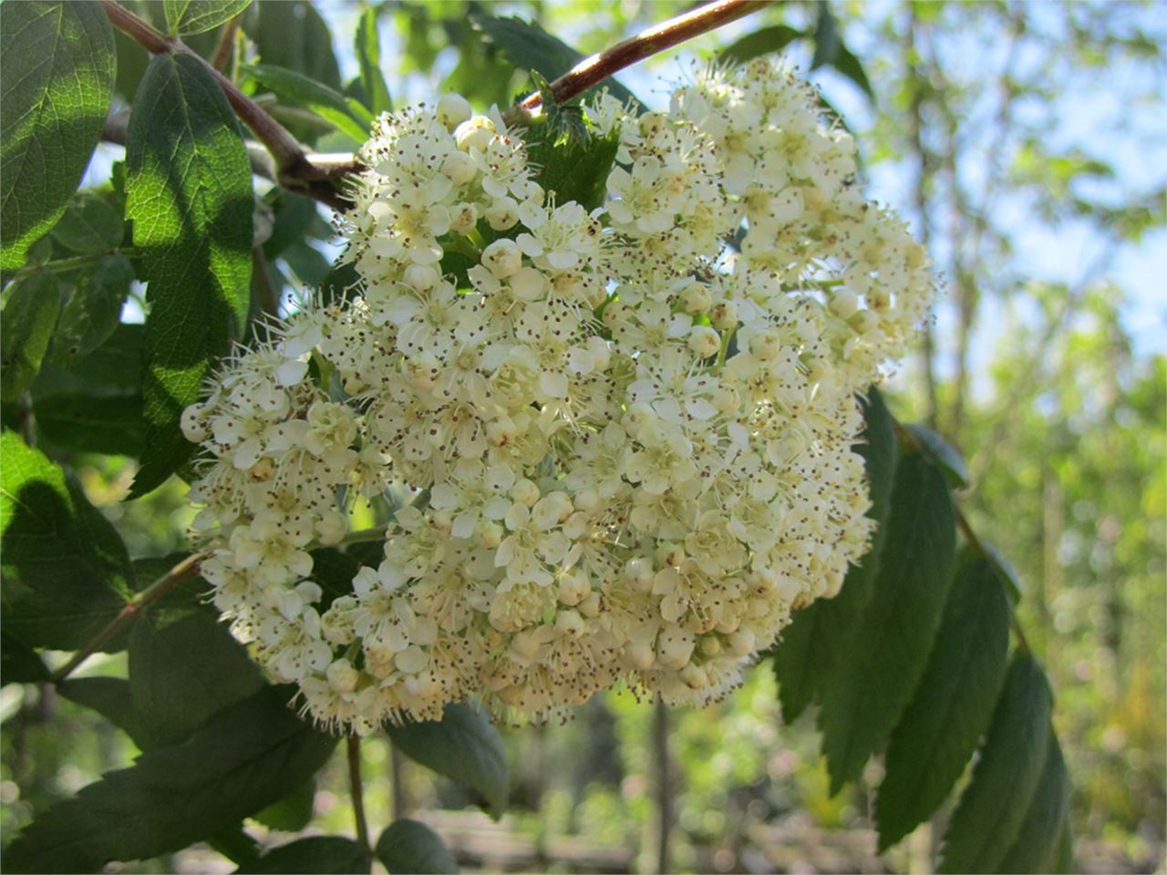 Le infiorescenze sono ricchi corimbi eretti dal diametro sino a 15 cm e hanno asse pubescente. I fiori numerosi, ermafroditi, compaiono fra maggio e luglio; sono portati da peduncoli; corolla con petali obovati, bianchi di 5 mm; stami 20; stili 3 liberi.